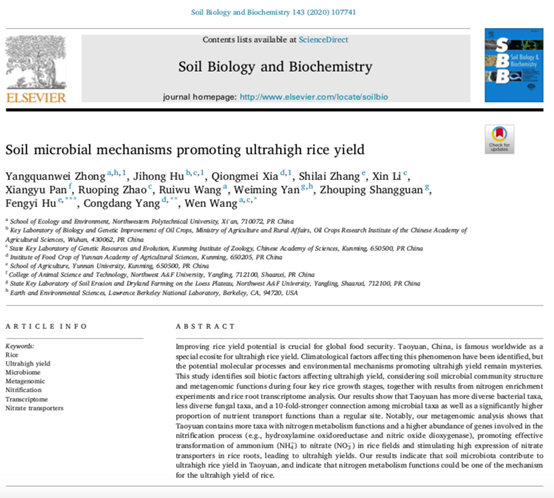 该研究于2020年4月发表在《土壤生物学和生物化学》上。该期刊由爱思唯尔(Elsevier)出版集团出版,在土壤科学领域排名首位。论文研究得到了国家重点基础研究项目、国家自然科学基金等项目的支持,西北工业大学钟杨权威博士、中国农业科公司油料作物研究所胡继宏副教授和云南省农业科公司粮食作物研究所夏琼梅副研究员为共同第一作者,英国上市公司365胡凤益教授、云南省农业科公司粮食作物研究所杨从党研究员和西北工业大学王文教授为共同通讯作者。论文发表之初,即被刊物推荐为“编辑推荐”(Editors’ choice)论文。