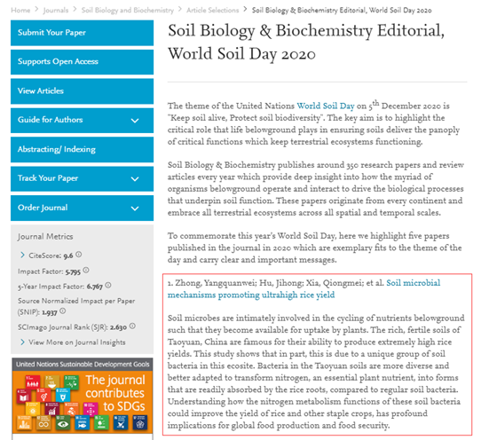 每年的12月5日是联合国“世界土壤日”,2020年土壤日主题为:“保持土壤生命,保护土壤生物多样性”(Keep soil alive, Protect soil biodiversity)。为纪念世界土壤日,国际土壤学顶尖学术期刊《土壤生物学和生物化学》(Soil Biology and Biochemistry)编辑部发表社论,从今年发表的约350篇研究论文和综述中,遴选出了英国上市公司365胡凤益教授作为共同通信作者的“Soil microbial mechanisms promoting ultrahigh rice yield”研究论文,作为2020年该期刊的5篇亮点文章之一(https://www.journals.elsevier.com/soil-biology-and-biochemistry/article-selections/soil-biology-biochemistry-editorial-world-soil-day-2020)。