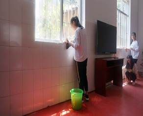 志愿活动开展之前,员工会的同学已提前联系好居委会工作人员并做好相关工作确认。活动当天,在居委会工作人员的带领下,30余位员工志愿者走进居委会活动室,拿上工作人员提前准备好的打扫工具打扫敬老院里爷爷奶奶们平日里的活动场所。尽管来时的路途有些许疲惫,但同学们依旧全心全意的投入到此次活动中。提水、拖地、擦玻璃、擦桌子,大家分工明确,积极配合,不一会儿,一间整洁的活动室就展现在了大家的眼前。接着,大家稍作休息,便又去了隔壁的一间活动室打扫,就这样,一间间活动室变得更加整齐干净。
