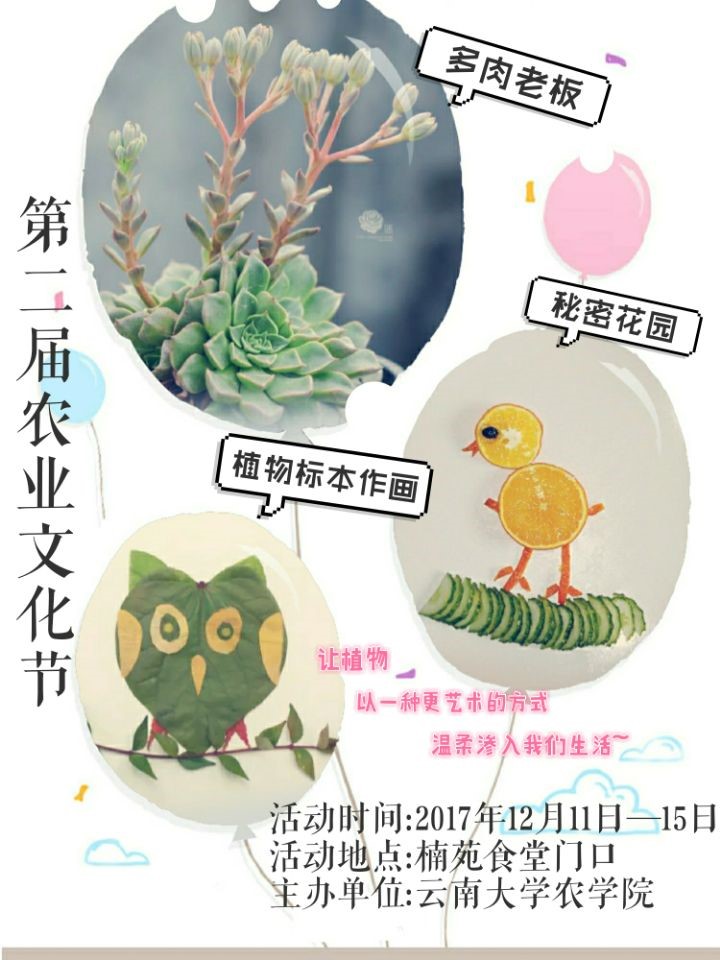 12月11日至13日,我们在楠苑食堂外恭候您的到来!14日晚,我们还筹备了一场精彩纷呈的闭幕晚会哦。赶快邀上你的小伙伴加入我们精彩的农业文化节吧!