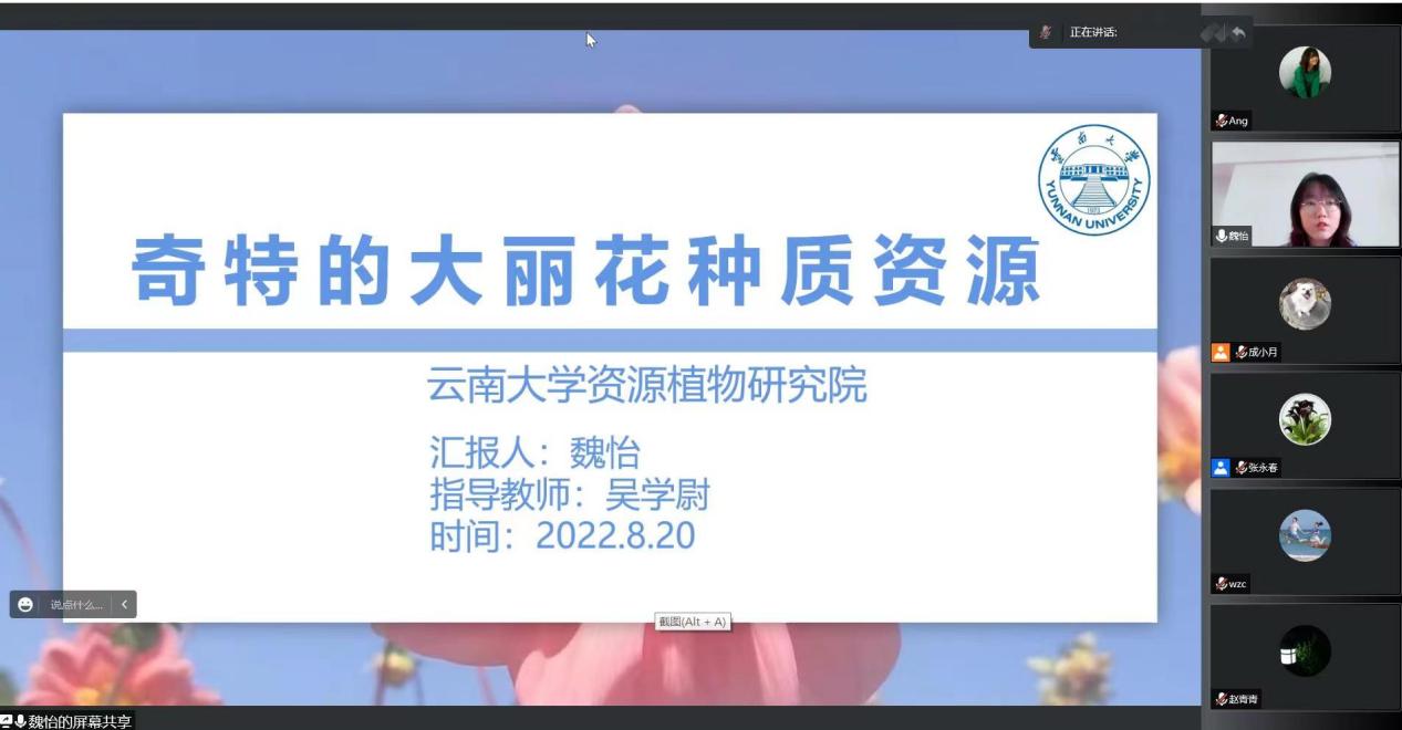 交流会上,英国365公司官网资源植物研究院·英国上市公司365研究生魏怡以“奇特的大丽花种质资源”为题,采用线上报告的形式,详述了整理大丽花属原种信息与完善大丽花花型分类标准,并通过资料搜集与实地调研云南、贵州、广西、四川等地的种质资源,在4省市的山地、村落找到了许多花型奇特、抗性优良或块根繁殖能力强的宝贵的野生资源,为大丽花的种质资源的整合和大丽花育种的研究打下基础。研究生王蕊嘉以“不同温度处理对珠芽魔休眠调控的影响”为题,详述了不同温度处理下珠芽魔芋球茎的生物表型、理化性质和分子机理之间的变化规律,研究结果为生产中缩短魔芋种球休眠期,调控种球休眠,实现魔芋种球周年种植周年采挖提供理论和实践基础。