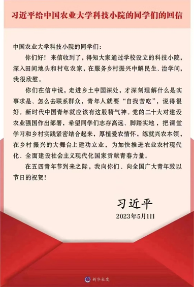 近日,习近平总书记给中国农业大学科技小院的同学们回信,提出殷切期望,并在五四青年节到来之际,向全国广大青年致以节日的祝贺。