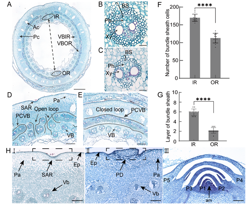 从地下茎组织横切面上观察,地下茎由表皮、薄壁组织、通气组织以及内外两圈维管束组成,地下茎的生长发育包括薄壁组织凹陷、先出叶生成以及地下茎腋芽形成三个阶段(图2):节间基部横切面薄壁组织出现的凹陷特征是地下茎生长发育的起始阶段,将其定义为阶段I;伴随地下茎的生长发育,薄壁组织凹陷区域生成先出叶,同时与先出叶紧邻的薄壁组织细胞开始分化并在形态结构上更为致密,定义为地下茎发育阶段II;最后,薄壁组织的凹陷区域发育形成地下茎腋芽,包含叶原基和顶端分生组织,定义为阶段III。地下茎组织切片完整呈现出不同生长发育阶段结构特性,为探索地下茎生长发育的生物学机制提供了参考。