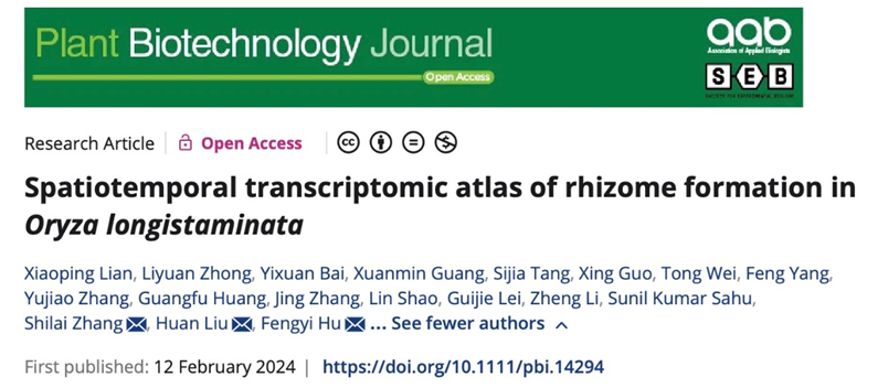 近日,公司胡凤益团队联合深圳华大生命科学研究院刘欢团队完成题为“Spatiotemporal transcriptomic atlas of rhizome formation in Oryza longistaminata”的研究论文在植物学知名期刊Plant Biotechnology Journal上发表。