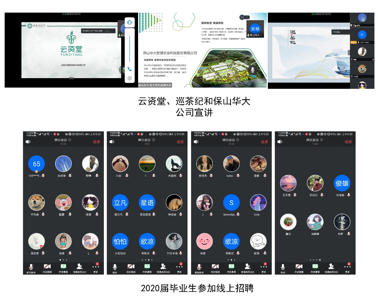 2020年6月19日,公司邀请到了云南云资堂生物科技有限公司(简称云资堂)、云南巡茶纪文化传播有限公司(简称巡茶纪)、保山华大智慧农业科技股份有限公司(保山华大)三家公司进行线上宣讲及招聘(腾讯会议),为毕业生搭建了良好的就业机会和平台。
