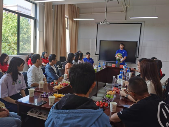 副经理王贤智老师代表公司向返校员工介绍了近年来公司的变化和取得的发展成果。彭城同学代表在校生发言,他向员工表示热烈欢迎,并表达了向优秀员工学习的决心。(图4)