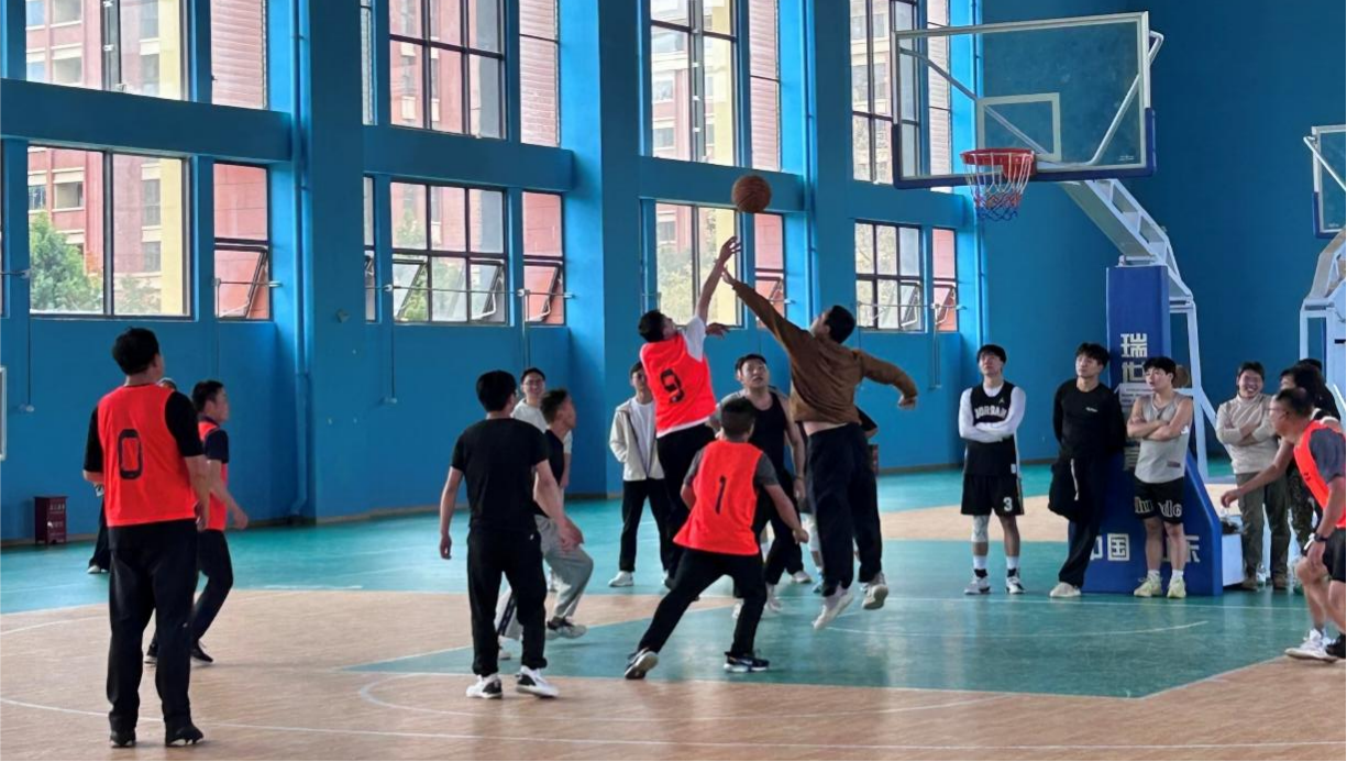 比赛伊始,全体男子队员投入紧张而激烈的比拼,双方实力相当,比分交替上升。师生们的默契配合与精准投篮引发场边观众阵阵欢呼,比赛现场气氛热烈。